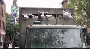 Across New York City this weekend, a slaughterhouse delivery truck is carrying 60 creatures to their death. But this is no ordinary truck and these are no ordinary creatures: the creatures are actually stuffed animals and the truck is a part of Banksy’s Better Out Than In street exhibit. Behold, Banksy’s Sirens Of The Lambs: